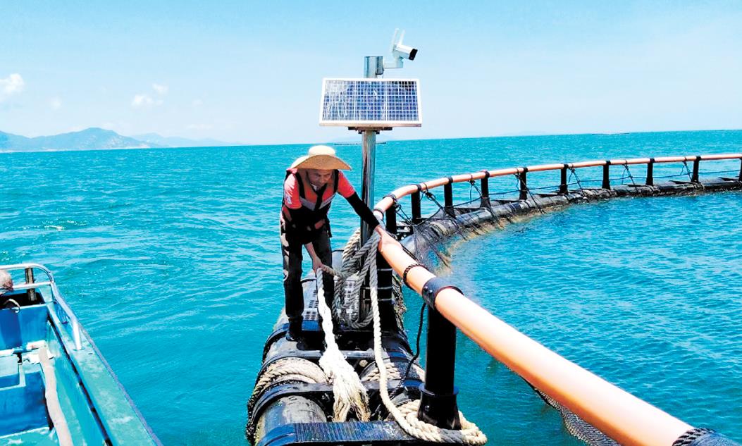 臺山海洋發(fā)展集團有限公司派遣專業(yè)團隊對網(wǎng)箱設(shè)施進行加固。