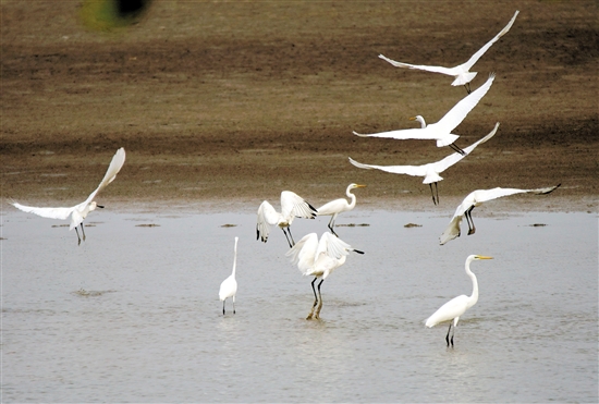 ????銀湖灣濕地公園位于新會銀洲湖出??谖鱾?cè),有完好的濕地原生態(tài)環(huán)境和優(yōu)美的自然風(fēng)光,融海、湖、田、山、水于一體,每年有數(shù)萬只候鳥在此越冬、遷徙停歇。此地候鳥種類達(dá)130多種,以水鳥為主,常見的有白鷺、鷗類、野鴨及鸻鷸類,并有較珍稀的國家一級保護(hù)動物黑臉琵鷺。