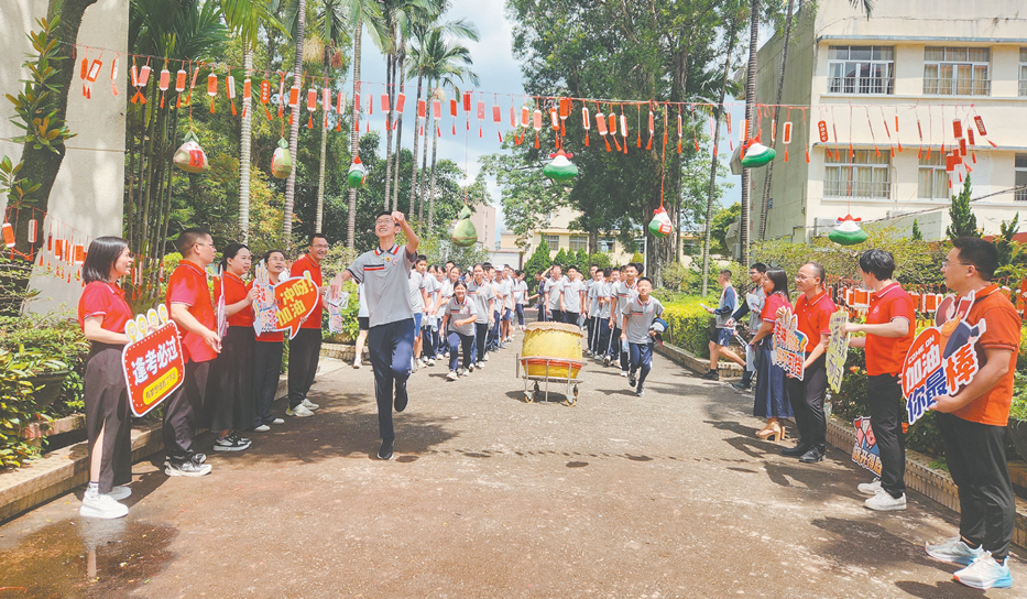蓬江區(qū)荷塘中學為考生擂鼓助威,考生跳高摸“粽子”,期待“一舉高中”。 學校供圖