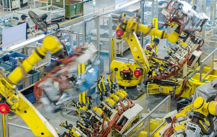??2025年10月9日,浙江省湖州市長興經(jīng)濟(jì)技術(shù)開發(fā)區(qū)一家汽車部件有限公司的技術(shù)人員操控工業(yè)機(jī)器人生產(chǎn)新能源汽車配件(無人機(jī)照片)。新華社發(fā)(譚云俸攝)