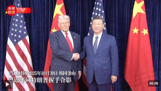 ? 當?shù)貢r間10月30日中午,中美元首會晤開始前,習近平同特朗普握手合影。