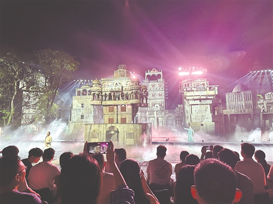 ????晚上8時(shí)30分,赤坎華僑古鎮(zhèn)的晚風(fēng)裹著僑鄉(xiāng)煙火氣,人流循著燈光向水劇場(chǎng)聚攏。不過半小時(shí),劇場(chǎng)內(nèi)5000余個(gè)座位便座無(wú)虛席,觀眾手中的手機(jī)鏡頭已悄悄對(duì)準(zhǔn)舞臺(tái)——大家等候的,正是能讓開平碉樓故事“穿越時(shí)空”的《火秀》。