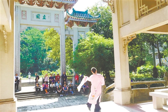 江門日報訊 (記者/李淑珩) 近日,在開平碉樓文化旅游區(qū)立園景區(qū),當游客行至?xí)駮_前,景區(qū)導(dǎo)賞員關(guān)穎嵐輕輕起嗓,只見她身形一轉(zhuǎn),衣袖輕揚,將一段粵曲娓娓唱來,與這座被譽為“中國華僑園林一絕”的園林展開一場跨越時空的“對話”。游客們紛紛駐足聆聽,在建筑細節(jié)中觸摸歷史痕跡,在悠揚粵曲中品味嶺南韻味。