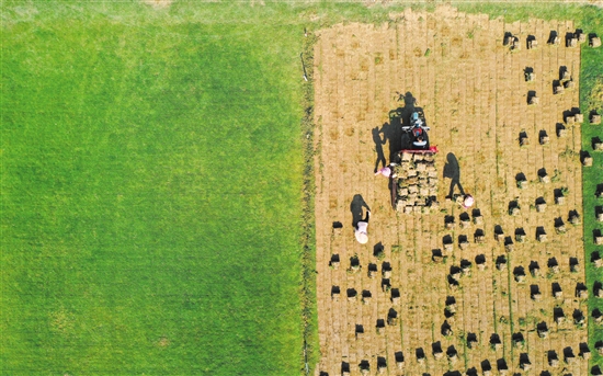 近日,新會區(qū)沙堆鎮(zhèn)那伏村、行灣村等地種植的草皮大面積收獲,農(nóng)民們忙著將長勢喜人的草皮按照一定的尺寸一塊塊鏟起、打包上市,忙得不亦樂乎。